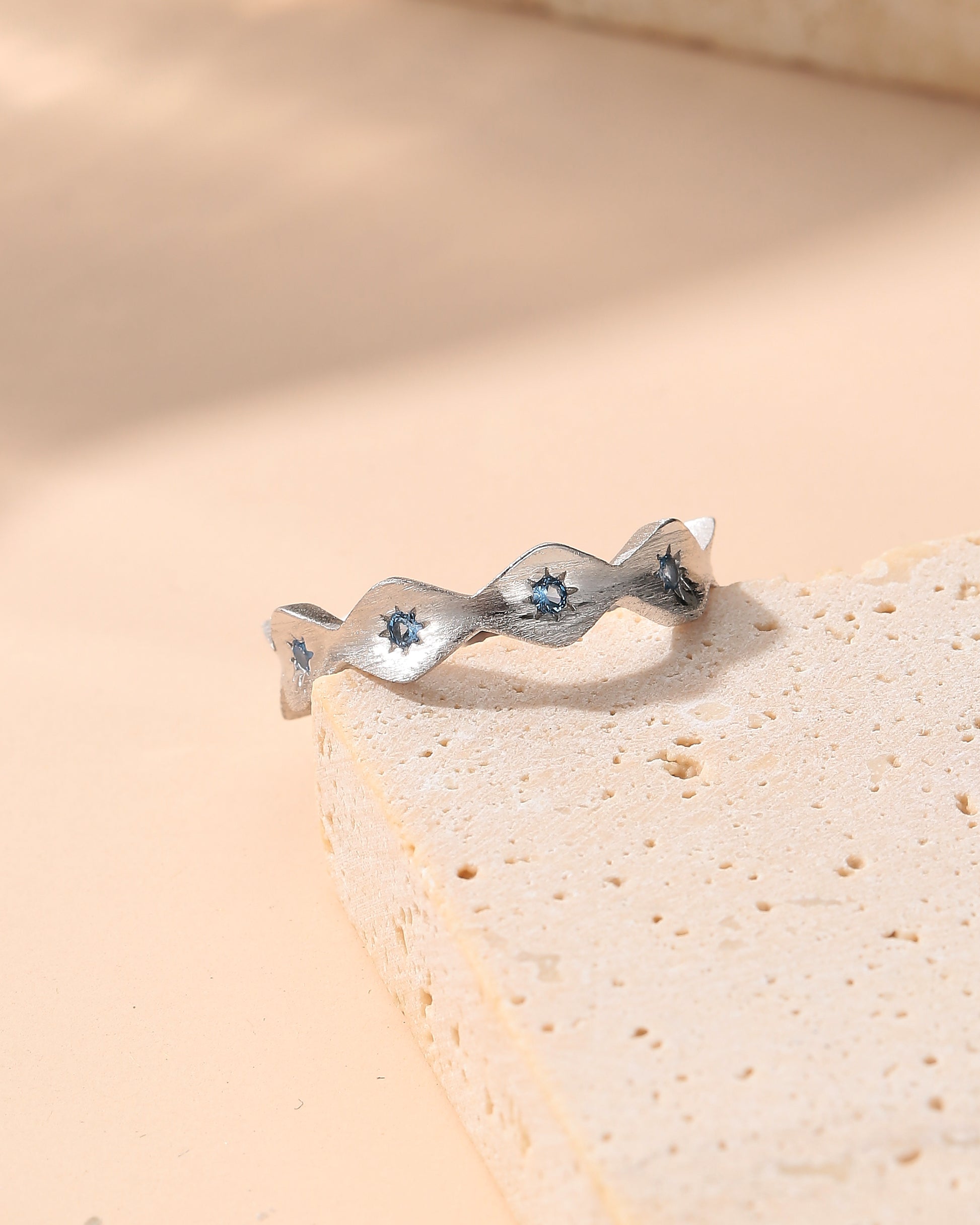 Each crest is adorned with delicately cut blue zircons that glimmer like starlight on water. Elegant yet understated, it captures both calm and brilliance in one timeless design.