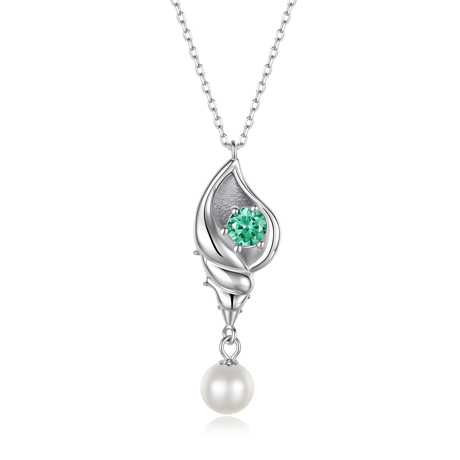 The pendant features a three-dimensional conch design, adorned with a sparkling green zircon and a lustrous pearl, capturing light from every angle. Playful yet refined, it adds a gentle touch of sophistication to any outfit.